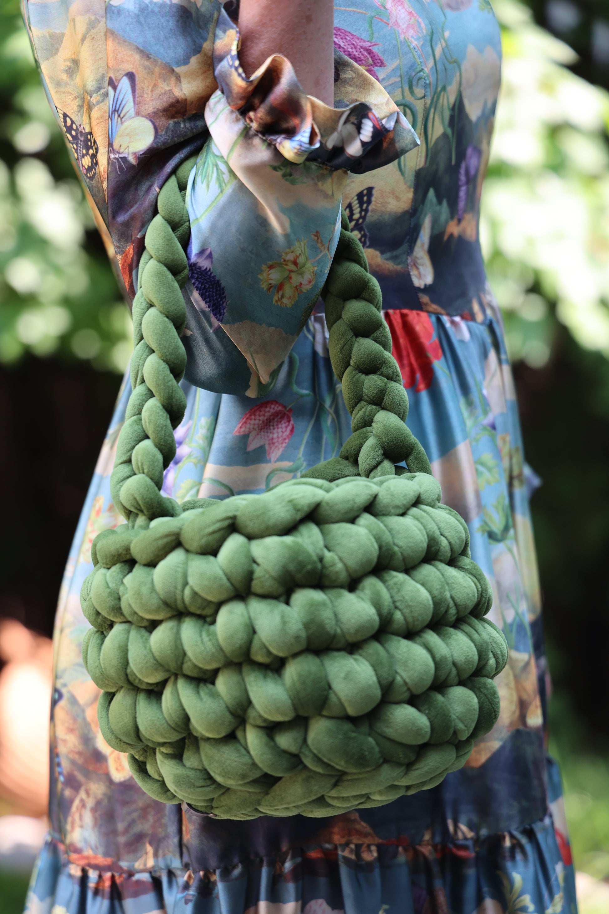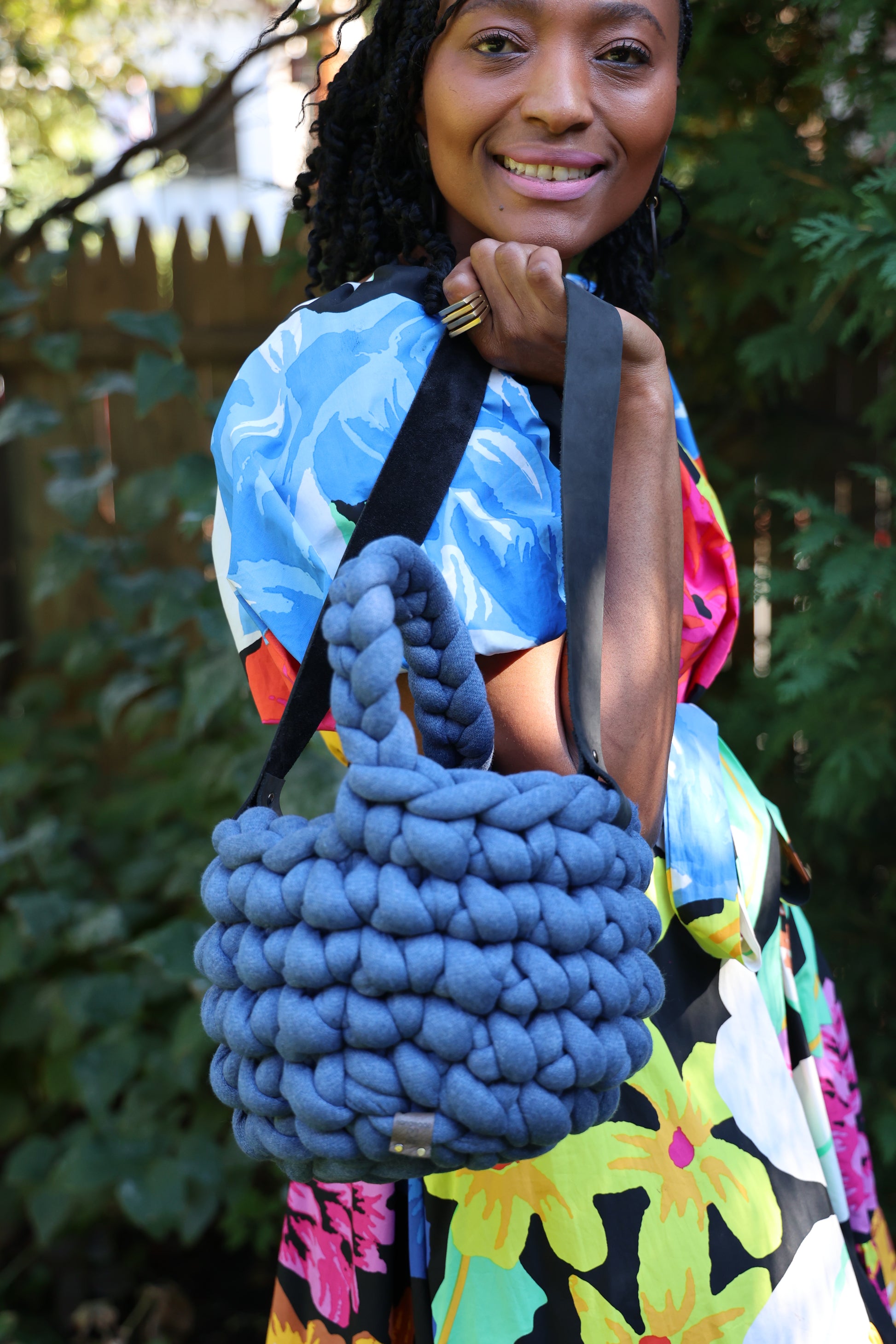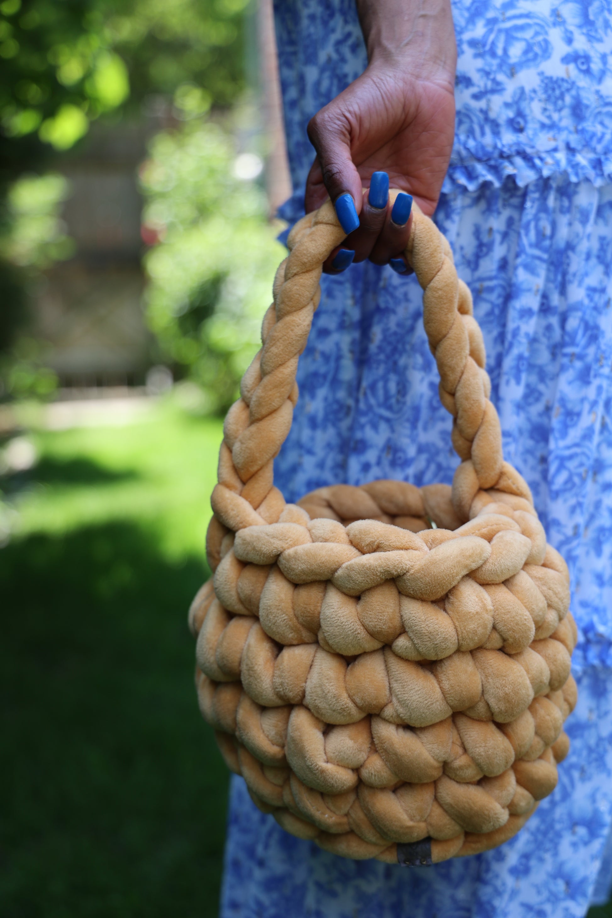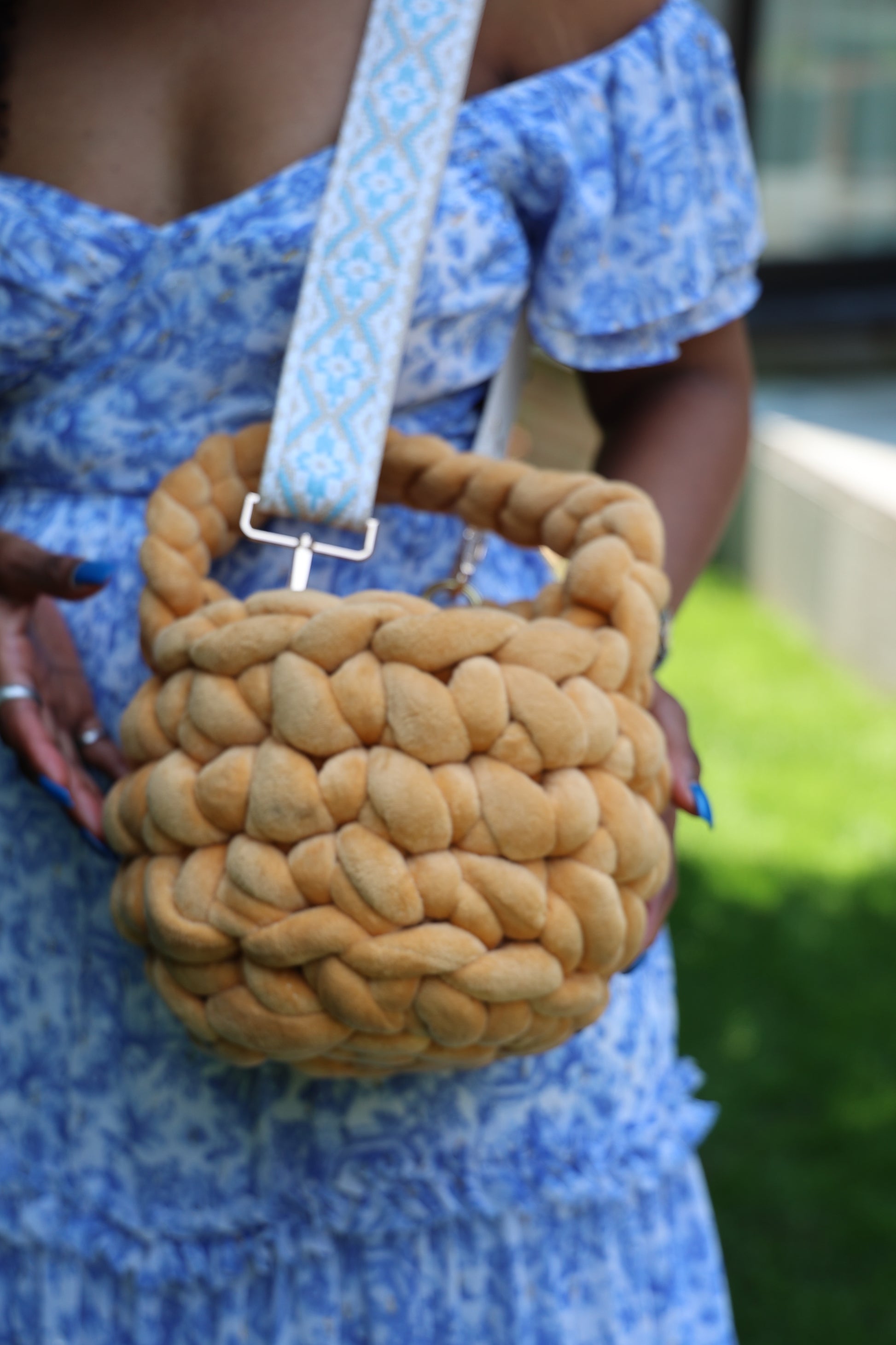 This is a circular bucket with handles and a strap to be worn wither way. Goes from the every day trip to the market, soccer fields to your punch for the night out.