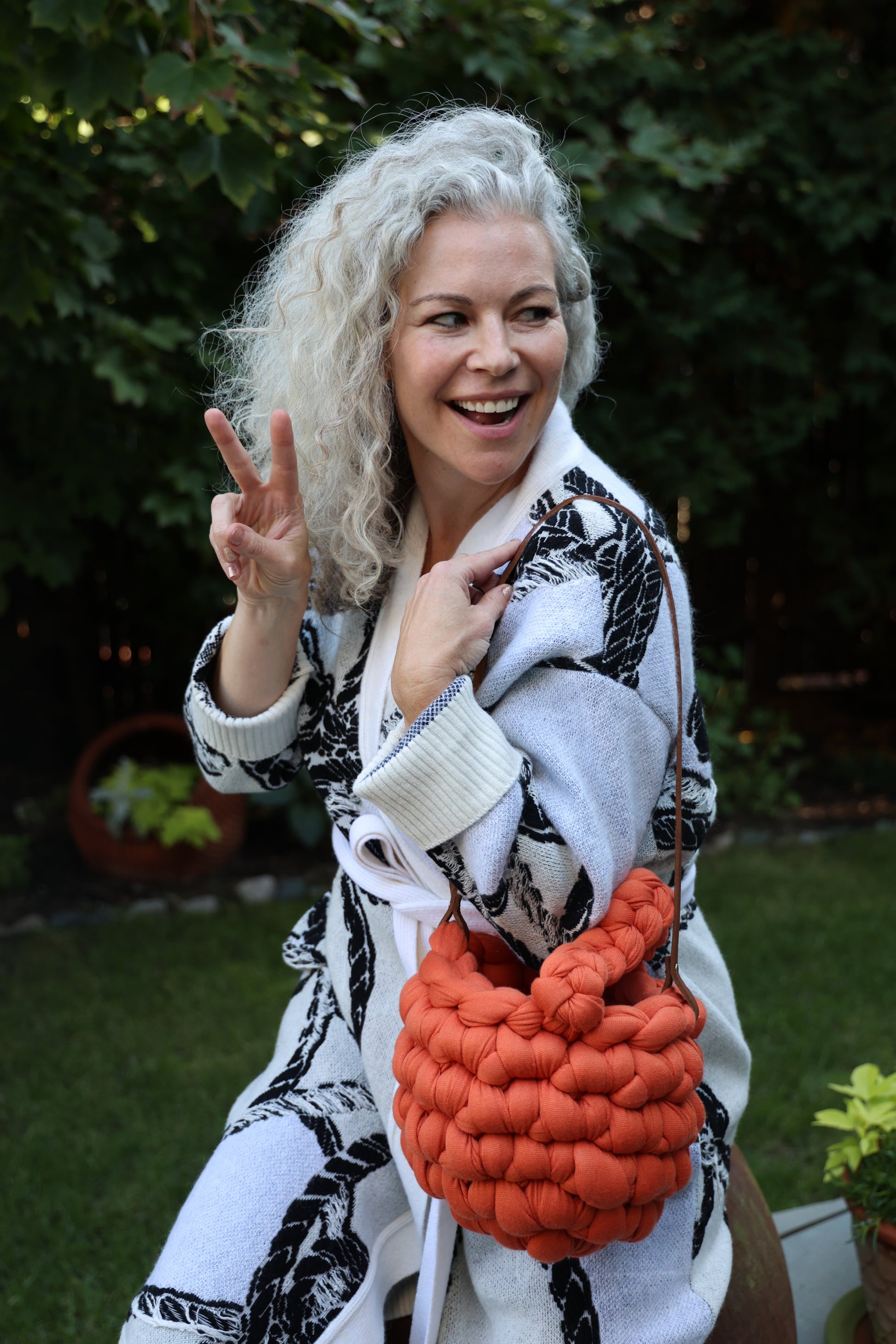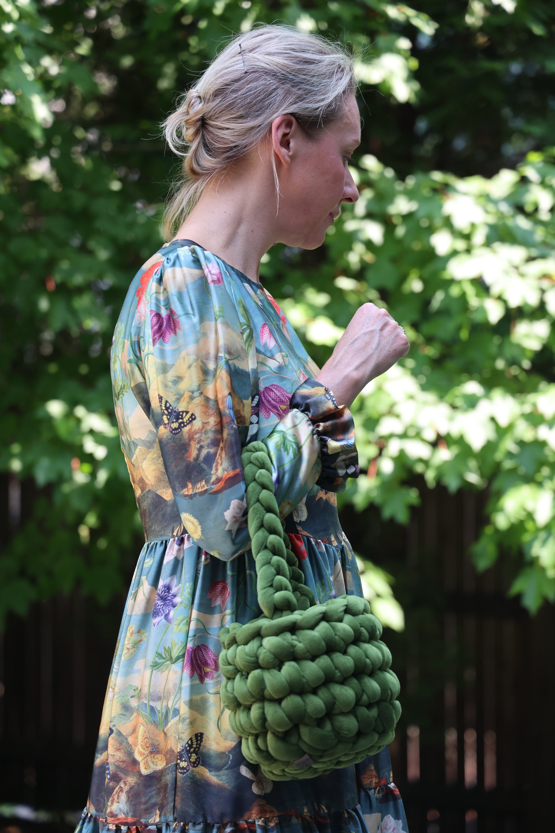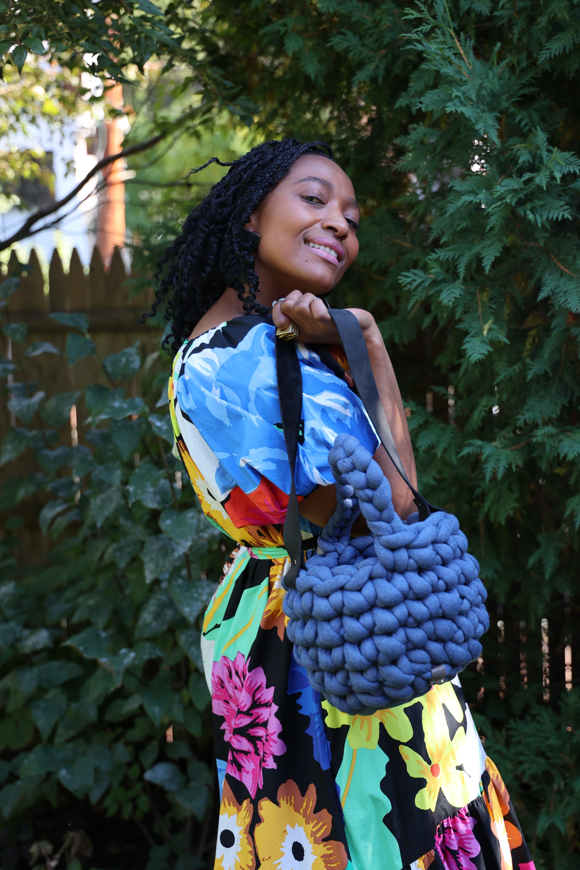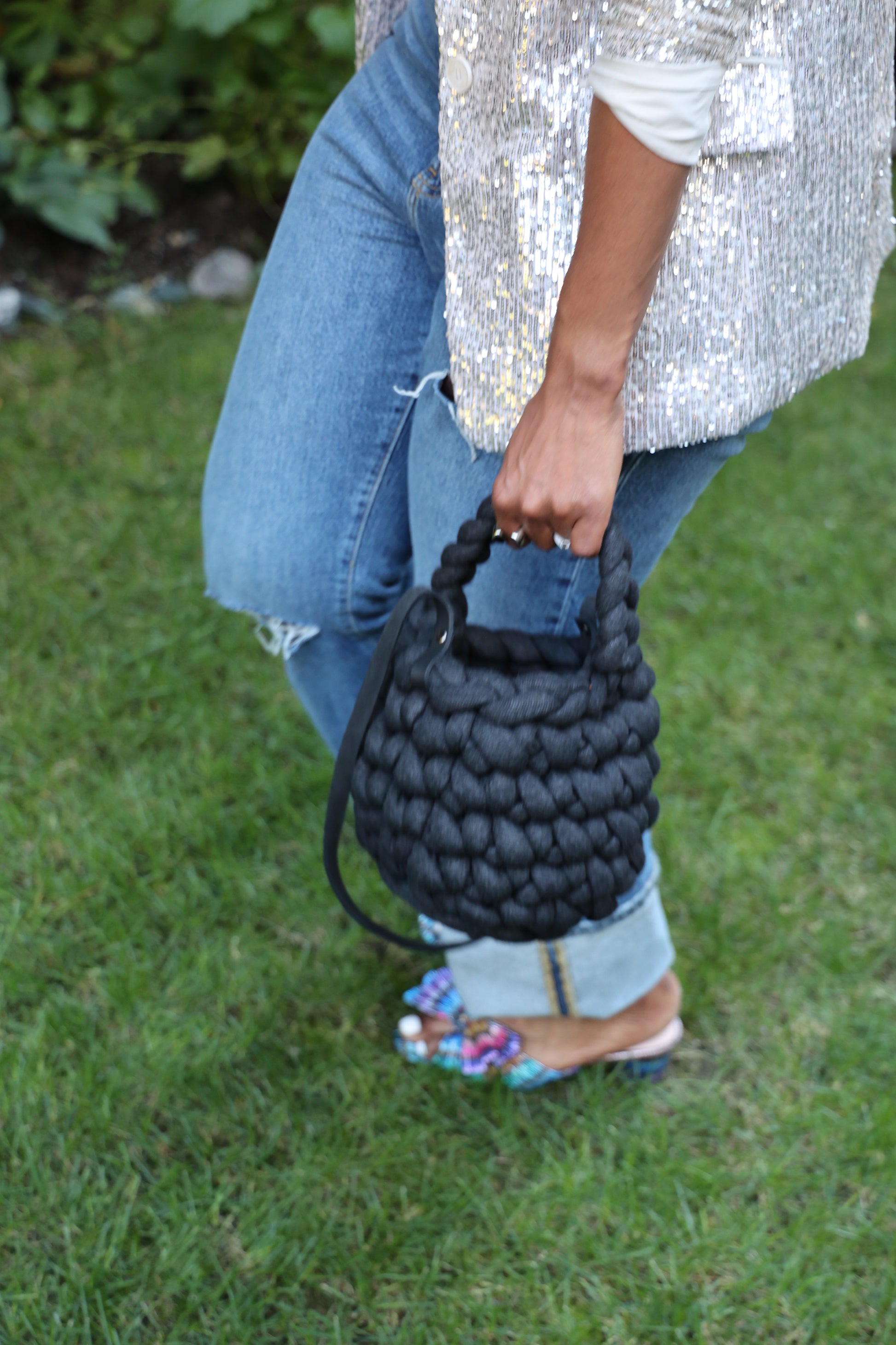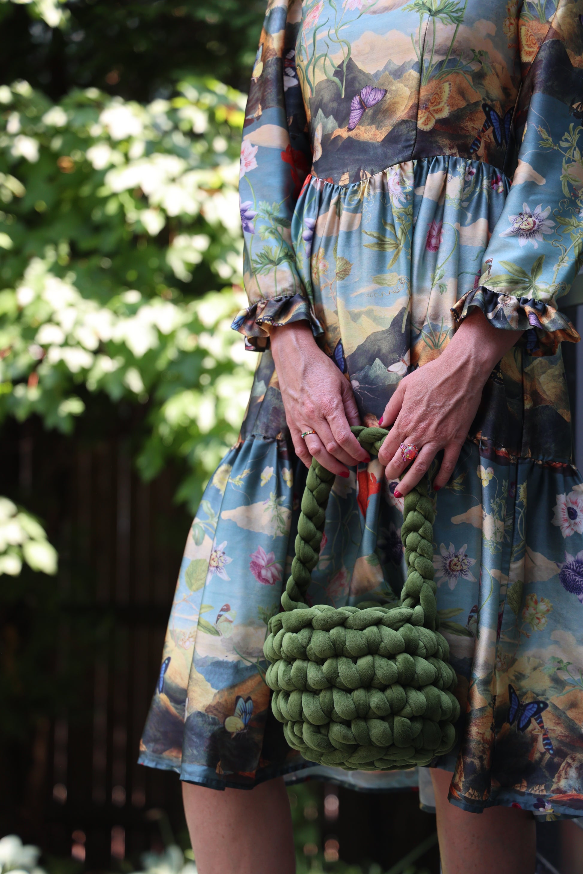 This is a circular bucket with handles and a strap to be worn wither way. Goes from the every day trip to the market, soccer fields to your punch for the night out.