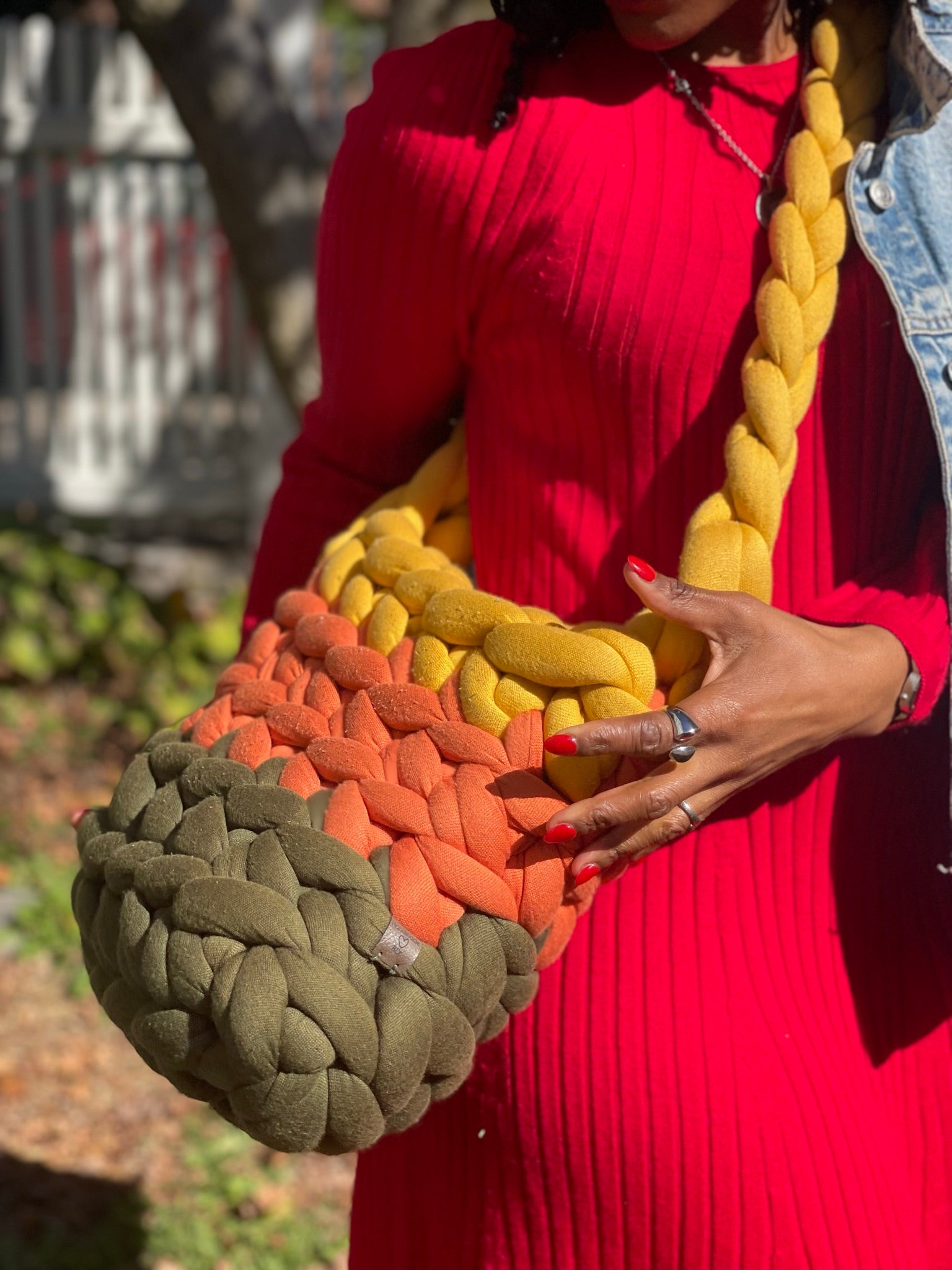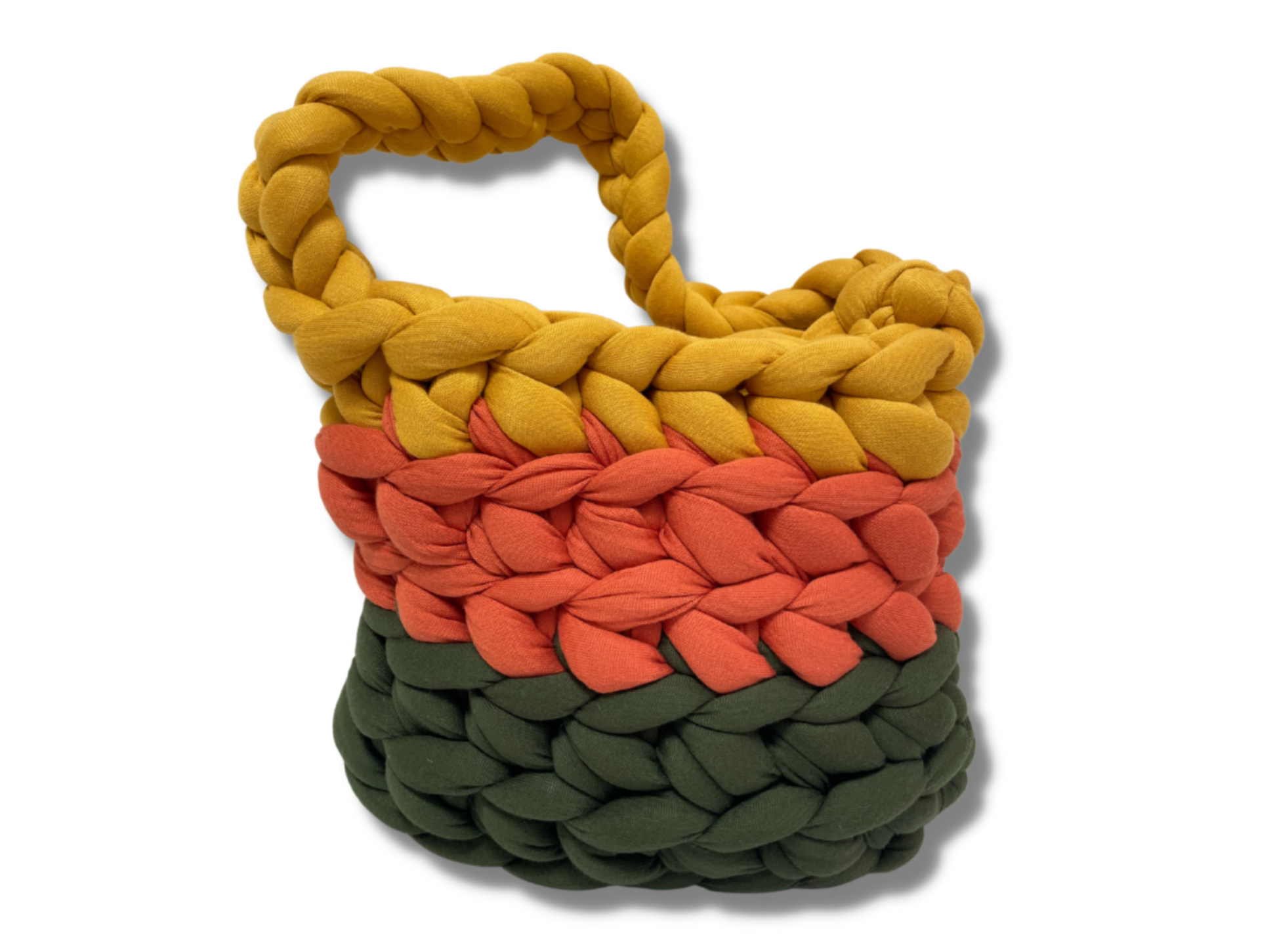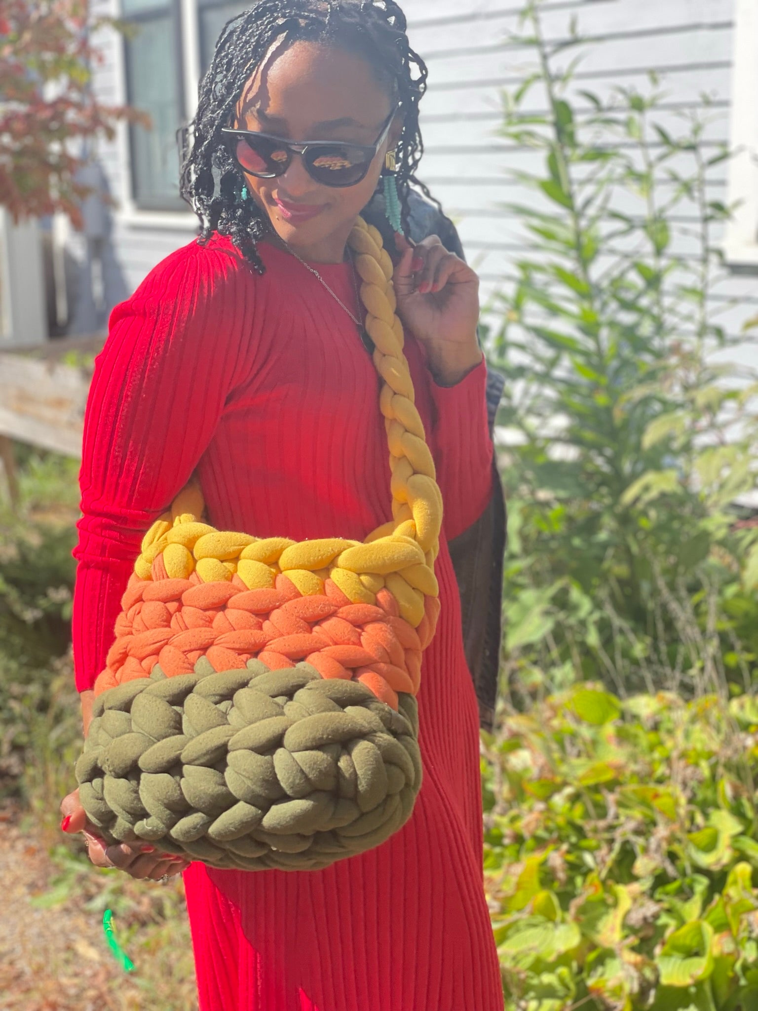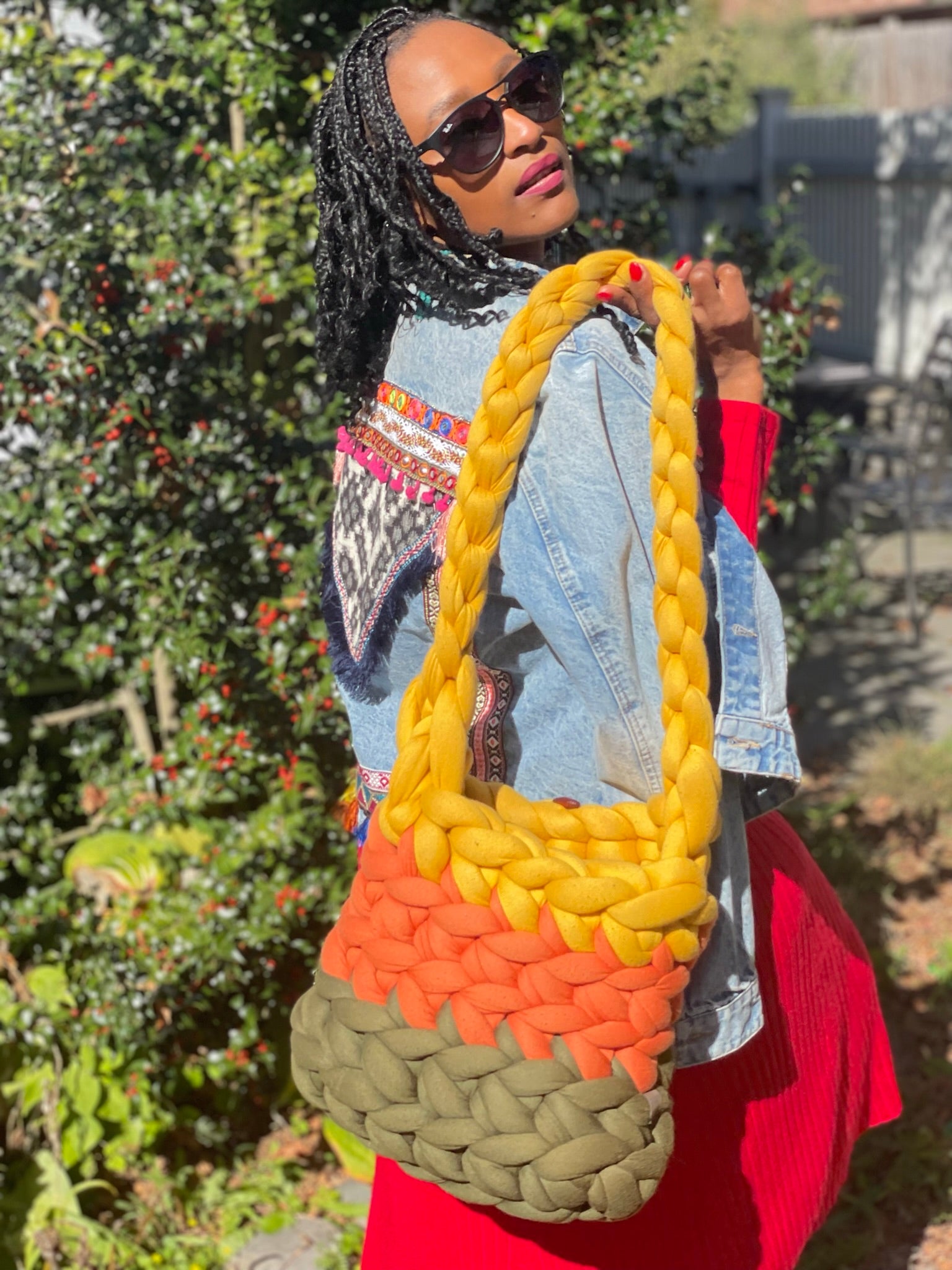 Can be worn as a bucket or a cross body, slightly smaller than the EM cross body, but same durability. Custom colors - custom design. This one specifically is made with very thick custom made yarn from BeCozi. Can do solid color or multi-colored up to 3 colors. Please use custom order form if you need a specific design.